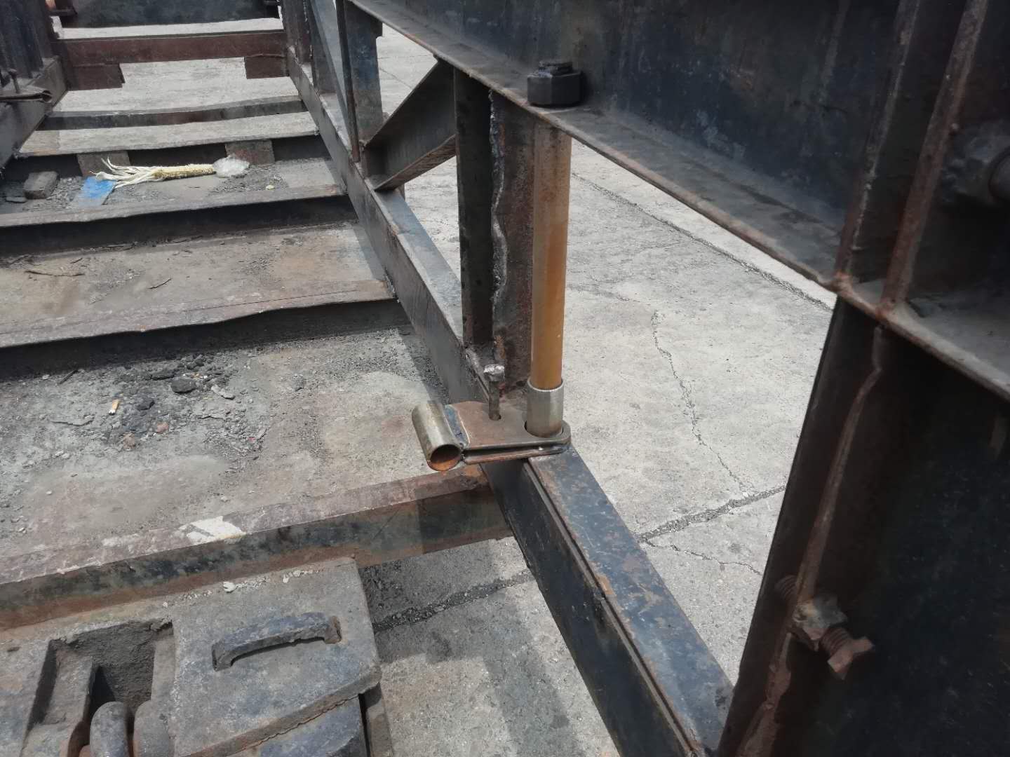 為了解決這些不安全因素,曉南礦研制了新型“錨索車(chē)”。該設(shè)計(jì)將原有錨索“8”字型裝車(chē)方法,改為“n”型對(duì)稱(chēng)裝車(chē)方法,且保證單根錨索一頭頂在碰頭側(cè)活門(mén)處,以保證車(chē)輛不偏重,錨索不彈出。卸車(chē)時(shí)將錨索一頭夾在釋放裝置內(nèi),另一頭用棕繩連接,將錨索車(chē)碰頭側(cè)活門(mén)打開(kāi),2人同時(shí)拽動(dòng)棕繩,即可將錨索拽至車(chē)輛下方,即節(jié)省了人工,又能避免錨索彈出傷人。同時(shí)設(shè)計(jì)制作了單根錨索頭套具,并配專(zhuān)用鎖緊扳手,防止在裝、卸車(chē)過(guò)程中造成錨索劈頭。