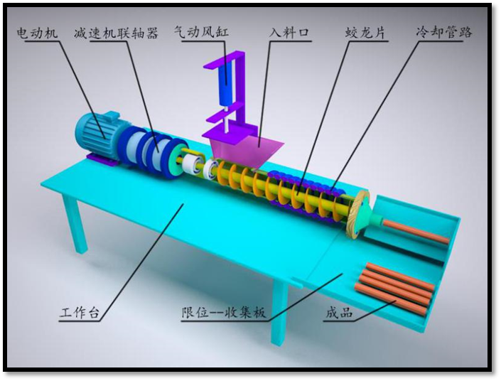 頂板預(yù)裂爆破是“110工法”的關(guān)鍵技術(shù)之一,預(yù)裂爆破效果的好壞也是“110工法”能否順利成功的關(guān)鍵因素之一。隨著“110工法”在曉南礦N1-1502運順工作面的具體實施,大大增加了頂板預(yù)裂爆破量,隨之黃泥柱(封泥)需求量也大幅度增加,由于人工用手搓成圓柱狀黃泥的方式效率極低,五個人搓一個班也無法滿足實際需求,并且成形不佳,影響爆破效果。針對這種實際情況,曉南礦研制了“自動成柱黃泥機”,并成功應(yīng)用在“110工法”施工中。該設(shè)備將濕潤的黃泥送進(jìn)入料口機后,自動生產(chǎn)出黃泥柱,與手工搓泥相比,成形效果佳、表面光滑、封孔嚴(yán)密、切縫爆破效果好。該設(shè)備由電動機、減速機、聯(lián)軸器、蛟龍片、限位收集板、入料口、外筒、氣動風(fēng)缸、冷卻器及各緊固件組成