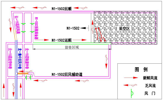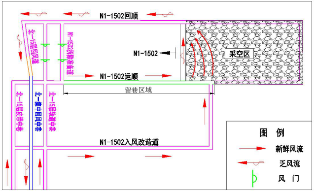 在留巷生產(chǎn)中由于運(yùn)順留巷段與工作面回風(fēng)隅角壓差較大,工作面絕對(duì)瓦斯涌出量達(dá)到18m?/min,且抽采效果不好,為了減少留巷段向采空區(qū)內(nèi)漏風(fēng),在集團(tuán)公司領(lǐng)導(dǎo)和處室技術(shù)人員共同指導(dǎo)下對(duì)通風(fēng)系統(tǒng)進(jìn)行調(diào)整。將N1-1502入風(fēng)改造道更改為N1-1502回風(fēng)輔助道,N1-1502運(yùn)輸順槽入風(fēng),N1-1502回風(fēng)輔助道和N1-1502回風(fēng)順槽回風(fēng)。見(jiàn)圖5 曉南礦N1-1502工作面調(diào)整后期通風(fēng)系統(tǒng)圖。