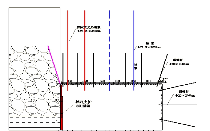 第一步:利用恒阻錨索對(duì)巷道頂板加強(qiáng)支護(hù),以保證隨后預(yù)裂頂板、切頂時(shí)不影響自動(dòng)形成的巷道質(zhì)量;