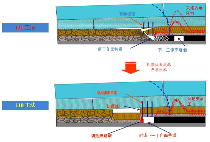 采用“110工法”切頂卸壓自動(dòng)成巷技術(shù),每回采一個(gè)工作面,只需掘進(jìn)一條順槽,不用留設(shè)護(hù)巷煤柱。通過(guò)恒阻錨索加強(qiáng)頂板支護(hù),保證恒阻錨索吊住上覆巖層基本頂,并使用聚能管進(jìn)行頂板定向預(yù)裂爆破,工作面周期來(lái)壓時(shí)頂板能沿著預(yù)裂方向?qū)㈨敯迩新湎聛?lái)形成巷幫,切斷壓力傳導(dǎo),實(shí)現(xiàn)卸壓作用,最后使用架后擋矸支護(hù)維護(hù)新形成的巷道作為下一個(gè)工作面順槽,改變?yōu)橐幻嬉幌锊删蚰J?。?duì)于曉南礦安全高效開(kāi)采具有重大的技術(shù)、經(jīng)濟(jì)、社會(huì)意義。 圖2 110工法與121工法對(duì)比圖