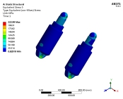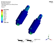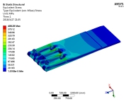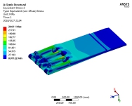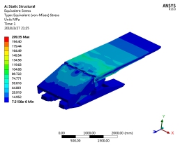 ??????? 工況1條件下的液壓支架頂梁應(yīng)力云圖可見,頂梁的應(yīng)力主要分布柱窩和中間筋板附近。柱窩附近的應(yīng)力達(dá)到峰值,已達(dá)244.11MPa,并且由于偏置載荷的作用,左側(cè)柱窩的應(yīng)力高于右側(cè)柱窩應(yīng)力。頂梁中間筋板左側(cè)上部的應(yīng)力比較大,已達(dá)156.21MPa,而在頂梁右側(cè)的柱窩附近應(yīng)力達(dá)135.88MPa,左右柱窩處應(yīng)力差為20.33MPa。液壓支架在實際使用過程中經(jīng)常出現(xiàn)立柱頂斷銷軸后活塞桿頂進(jìn)液壓支架頂梁的情況,此處分析與實際工況相符。頂梁柱窩處是頂梁在承受頂板載荷時的主要承力部位,此部位的強(qiáng)度直接影響液壓支架整機(jī)的使用壽命。除了柱窩附近有應(yīng)力集中處外,頂梁其他部分的應(yīng)力并不高,在許用應(yīng)力范圍。