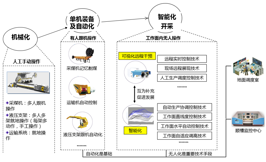 煤炭開采技術(shù)及裝備發(fā)展迅速,綜采工作面經(jīng)歷了機械化->自動化->智能化開采。