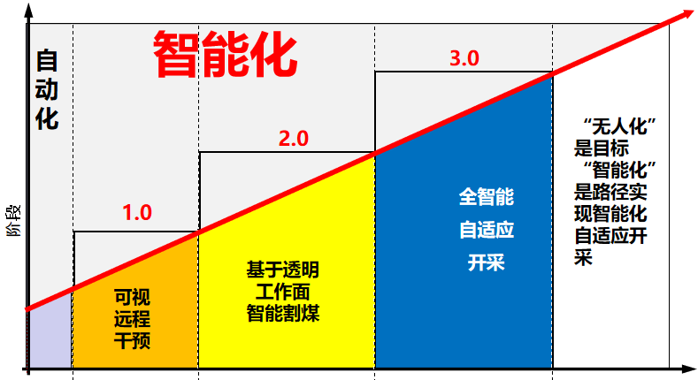 通過可以遠程干預(yù)有限無人化采煤—基于透明工作面智能割煤—全智能自適應(yīng)開采,逐步從1.0過渡到3.0完全實現(xiàn)無人全智能自適應(yīng)開采。