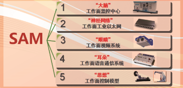 SAM型綜采自動化控制系統(tǒng),SAM型綜采自動化控制系統(tǒng)分為“大腦”工作面監(jiān)控中心、“神經(jīng)網(wǎng)絡(luò)”工作面工業(yè)以太網(wǎng)、“眼睛”工作面視頻系統(tǒng)、“耳朵”工作面語音通信系統(tǒng)、“思想”工作面控制模型。N2-407綜采工作面自動化控制系統(tǒng)將多種跨學科技術(shù)(包括工業(yè)控制、以太網(wǎng)、無線、視頻、音頻、通信、液壓等)綜合應(yīng)用。在地面綜合監(jiān)控中心對綜采設(shè)備進行自動化控制,確保各設(shè)備協(xié)調(diào)、連續(xù)、高效、安全運行,將工人從工作面解放出來,實現(xiàn)工作面少人化。實現(xiàn)在采煤生產(chǎn)過程中以采煤機記憶割煤為主,人工遠程干預(yù)為輔;以液壓支架跟隨采煤機自動移架為主,人工遠程干預(yù)為輔;以綜采運輸設(shè)備集中自動化控制為主,就地控制為輔;以綜采設(shè)備智能感知為主,視頻監(jiān)控為輔;即“以工作面自動控制為主,監(jiān)控中心遠程干預(yù)控制為輔”的自動化生產(chǎn)模式。建立工作面內(nèi)、地面綜合調(diào)度中心2層控制系統(tǒng)架構(gòu),完成工作面割煤、移架、推溜、運輸?shù)攘鞒讨悄芑\行。