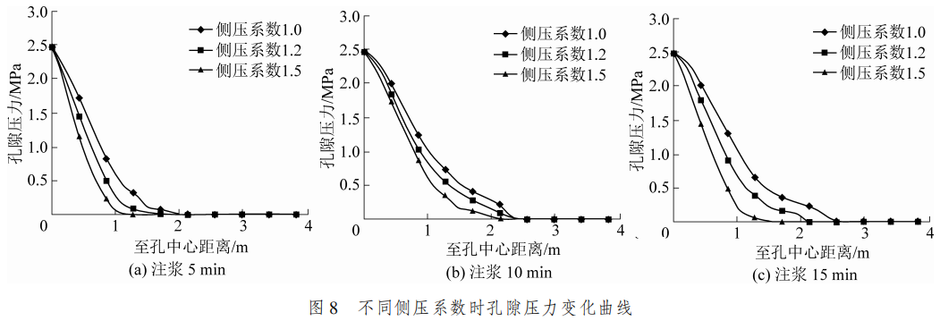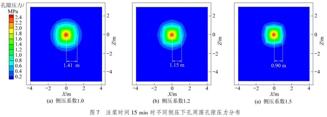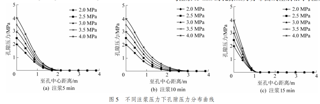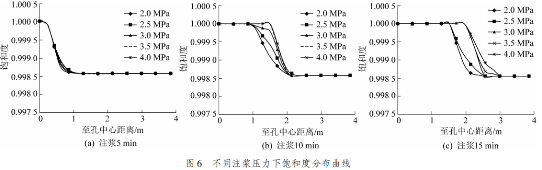 以此參數(shù)為基礎(chǔ),通過數(shù)值模擬試驗揭示了注漿孔周邊孔隙壓力分布與飽和度變化規(guī)律,分析了掘進工作面不同應(yīng)力狀態(tài)對漿液擴散的影響,對比了不同注漿壓力下孔隙壓力和飽和度分布曲線,發(fā)現(xiàn)應(yīng)力狀態(tài)對漿液最大擴散半徑影響較小,提高注漿壓力能在一定時間段內(nèi)提高注漿效率,但并不能顯著提高漿液擴散半徑。