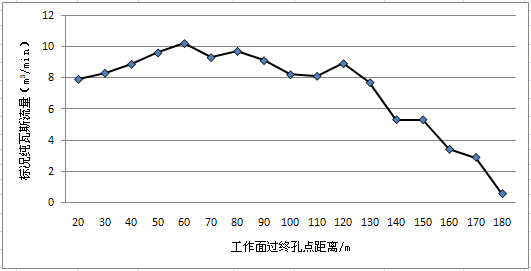 初期抽采階段為工作面推進且過鉆孔終孔點20m時,高位水平長鉆孔瓦斯流量明顯增大,其中5#孔純量達2.62m3/min。工作面繼續(xù)推進100m范圍內(nèi)為抽采穩(wěn)定階段。當(dāng)工作面過終孔點距離120m以后,鉆場開始進入抽采衰減階段,此時下一個接續(xù)鉆場正好處于鉆孔初期抽采階段,保證工作面持續(xù)抽采。