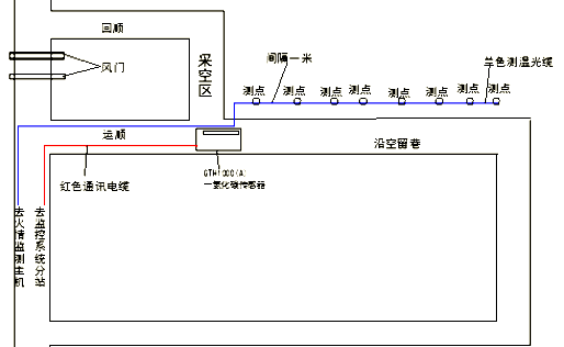 4.1.1 利用火情監(jiān)測系統(tǒng),對N1-1502 “110工法”工作面采空區(qū)進(jìn)行溫度預(yù)測、預(yù)報的安設(shè),具體的安設(shè)方法是:預(yù)先在采空區(qū)內(nèi)沿沿空留巷采空區(qū)內(nèi)鋪設(shè)一條測溫光纜,對沿空留巷的采空區(qū)內(nèi)的溫度進(jìn)行實時檢測,測點(diǎn)可以定為1m。通過對火情監(jiān)測系統(tǒng)一年來在曉南煤礦的使用,火情監(jiān)測系統(tǒng)對煤礦早期的自然發(fā)火的預(yù)測、預(yù)報、預(yù)防起到了很好的作用。當(dāng)某個測點(diǎn)溫度達(dá)到40。C時,發(fā)出報警信號,再根據(jù)測點(diǎn)顯示的高溫位置,采取防治措施,具體安裝方法如圖3所示: