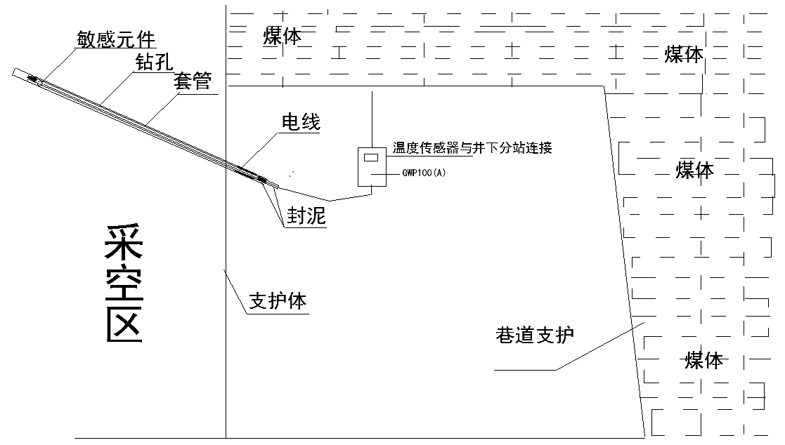 4.1.2利用溫度傳感器,對沿空留巷沿途每間隔100m進(jìn)行重點(diǎn)區(qū)域進(jìn)行檢測,確保數(shù)據(jù)準(zhǔn)確及可靠。采空區(qū)檢測點(diǎn)距支護(hù)巷道表面1.5-3.0m的區(qū)間。為監(jiān)測5-7m區(qū)間采空區(qū)溫度的變化(如有需要可加長檢測元件電纜的長度),將GWP100(A)型溫度傳感器的檢測元件加長連接線(采用4×1.5mm2礦用阻燃電纜)達(dá)10m,在使用前對傳感器檢測數(shù)據(jù)失真狀況進(jìn)行調(diào)試,對自然發(fā)火重點(diǎn)部位打孔徑為Φ15mm、深度達(dá)到采空區(qū)5-7m,埋入傳感器檢測元件,將傳感器聯(lián)入礦井安全監(jiān)控系統(tǒng),從而實現(xiàn)對煤層深部自然發(fā)火溫度的自動、連續(xù)監(jiān)測,配合火情監(jiān)測系統(tǒng)測溫裝置,更好地實現(xiàn)預(yù)報自然發(fā)火的作用。