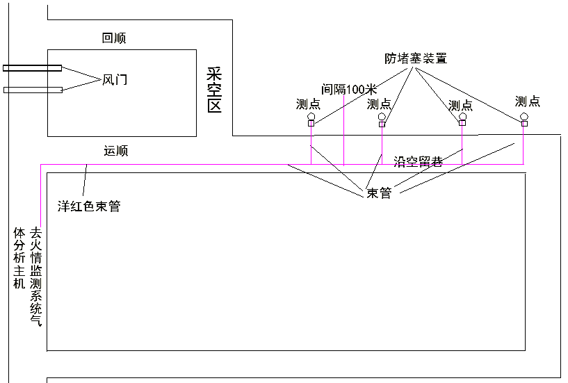 4.1.4利用火情監(jiān)測系統(tǒng)氣體分析主機(jī)對沿空留巷采空區(qū)的氣體進(jìn)行分析化驗后將數(shù)據(jù)傳輸?shù)降孛婊鹎楸O(jiān)測系統(tǒng)中心站,并對數(shù)據(jù)進(jìn)行分析處理被告超限報警。在回風(fēng)留巷打孔,將束管穿過支護(hù),進(jìn)入采空區(qū)3到5m(如有需要可以根據(jù)實際情況加長束管的伸入長度),為防止束管口堵塞,管中要安設(shè)防堵塞裝置,當(dāng)CH4、CO、C2H2、O2?和CO2這幾種氣體中,CO、C2H2出現(xiàn)時,說明采空區(qū)已有自燃發(fā)火現(xiàn)象。安裝方法見圖6所示。