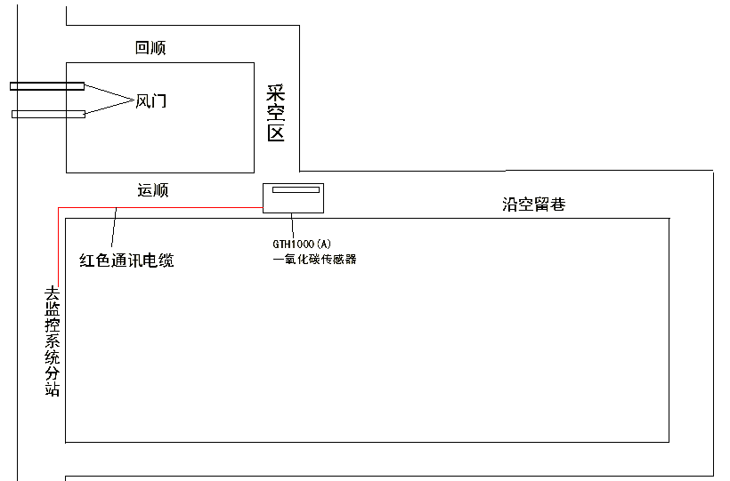 ? ? 4.1.5因為自然發(fā)火是一個較慢長的變化,所以在沿空留巷的末端也就是N1-1502工作面運(yùn)順端頭,安設(shè)一臺一氧化碳傳感器,來檢測通過沿空留巷風(fēng)流的一氧化碳濃度,以此來判斷沿空留采空區(qū)是否有自然現(xiàn)象及采空區(qū)是否有風(fēng)漏入沿空留巷,從而來分析采空區(qū)的自然發(fā)火情況,當(dāng)一氧化碳含量達(dá)到100ppm時,說明自燃發(fā)火存在自燃發(fā)炎現(xiàn)象。一氧化碳傳感器的安設(shè)數(shù)量可以根據(jù)實際情況具體安設(shè),增加密度,CO傳感器的安設(shè)位置如圖7所示: