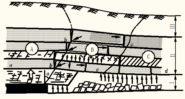A—煤壁支撐影響區(qū)(a-b);B-離層區(qū)(b- c);C-重新壓實(shí)區(qū)(c- d)
