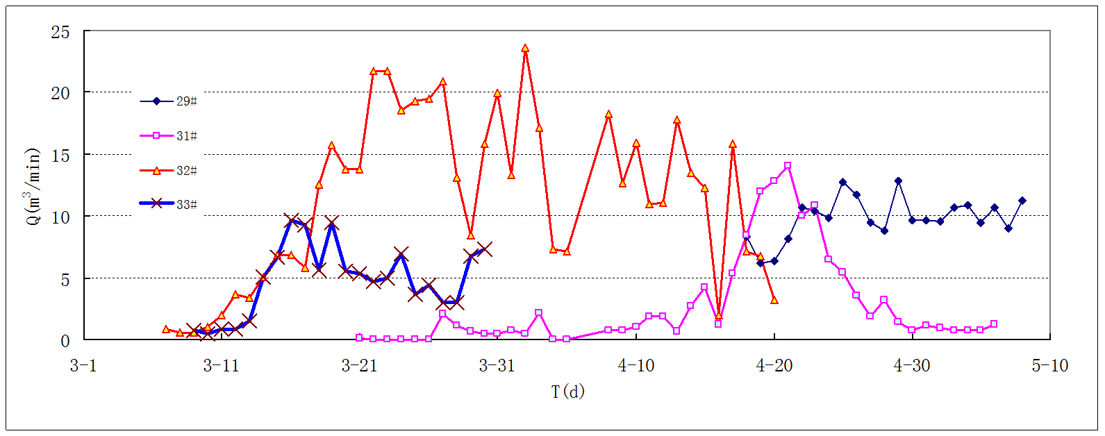 北二1203工作面在整個(gè)開(kāi)采過(guò)程中,共對(duì)31個(gè)鉆場(chǎng)計(jì)施工斜交鉆孔進(jìn)行了抽采,鉆孔工程量為30527m,抽采瓦斯純量392萬(wàn)m3。自2月22日回采以來(lái)至8月末,回順35#~20#鉆場(chǎng)陸續(xù)對(duì)采空區(qū)及鄰近層瓦斯進(jìn)行了抽采。從鉆場(chǎng)斜交鉆孔抽采數(shù)據(jù)統(tǒng)計(jì)來(lái)看,也存在著鉆場(chǎng)有效抽采鉆孔影響段較短、抽采效果一般、抽采時(shí)間及鉆孔參數(shù)需優(yōu)化等問(wèn)題。為了分析各鉆場(chǎng)抽采接續(xù)的相互影響,作出33#、32#、31# 、29#鉆場(chǎng)斜交鉆孔抽采量隨推進(jìn)時(shí)間變化曲線(xiàn)如圖3所示。