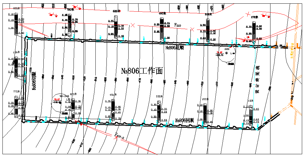 N3806工作面位于北三采區(qū)八層六段,運順長943m,回順長780m,切眼長260m。工作面所在區(qū)域地質(zhì)構(gòu)造簡單,根據(jù)工作面掘進(jìn)實見情況,N3806工作面回順實見F406-2斷層一處,傾向116°、傾角60°、落差0.5m,預(yù)計延伸至工作面內(nèi)10m,對工作面回采有一定影響,如圖1所示。