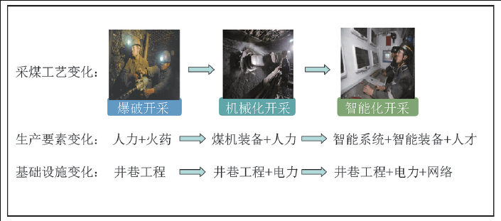 煤炭開(kāi)采經(jīng)歷了爆破開(kāi)采、機(jī)械化開(kāi)采,目前已向智能化開(kāi)采演進(jìn)與發(fā)展。在不同階段,主要生產(chǎn)要素與基礎(chǔ)設(shè)施也隨之發(fā)生變化并升級(jí),煤炭不同開(kāi)采階段生產(chǎn)要素與基礎(chǔ)設(shè)施變化如圖1所示。