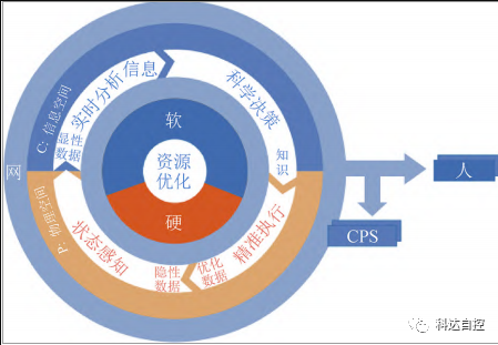 信息物理系統(tǒng) CPS (Cyber PhysicalSysG tems)是支撐信息化和工業(yè)化融合的綜合技術(shù)體系。近年來(lái)在各類(lèi)新技術(shù)發(fā)展的驅(qū)動(dòng)下,在部分行業(yè)得到了推廣應(yīng)用。CPS 的本質(zhì)是構(gòu)建一套信息空間與物理空間之間基于數(shù)據(jù)自動(dòng)流動(dòng)的狀態(tài)感 知、實(shí)時(shí)分析、科學(xué)決策、精準(zhǔn)執(zhí)行的閉環(huán)賦能體系,提高資源配置效率,實(shí)現(xiàn)資源優(yōu)化。它是基于硬件、軟件、網(wǎng)絡(luò)、平臺(tái)構(gòu)建的復(fù)雜系統(tǒng)。CPS 系統(tǒng)在對(duì)網(wǎng)絡(luò)內(nèi)部設(shè)備的遠(yuǎn)程協(xié)調(diào)能力、自治能力、控制對(duì)象的種類(lèi)和數(shù)量上,特別是網(wǎng)絡(luò)規(guī)模上遠(yuǎn)超現(xiàn)有的工控網(wǎng)絡(luò)。CPS 系統(tǒng)在層級(jí)內(nèi)包含了傳統(tǒng)的可編程邏輯控制器 (PLC)、分布式控制系統(tǒng) (DCS),但與之相比,在傳輸模式上由總線變?yōu)榫W(wǎng)絡(luò)協(xié)議通信,更具開(kāi)放性,并且由自動(dòng)控制變?yōu)樾畔⒒瘋鲗?dǎo)模式,傳導(dǎo)范圍比區(qū)域控制變得更為廣泛,實(shí)現(xiàn)了互聯(lián)互通與廣泛的數(shù)據(jù)融合,可以解決礦山復(fù)雜系統(tǒng)控制、智能無(wú)人開(kāi)采所需的技術(shù)支撐問(wèn)題。信息物理系統(tǒng) CPS的本質(zhì)如圖3所示。