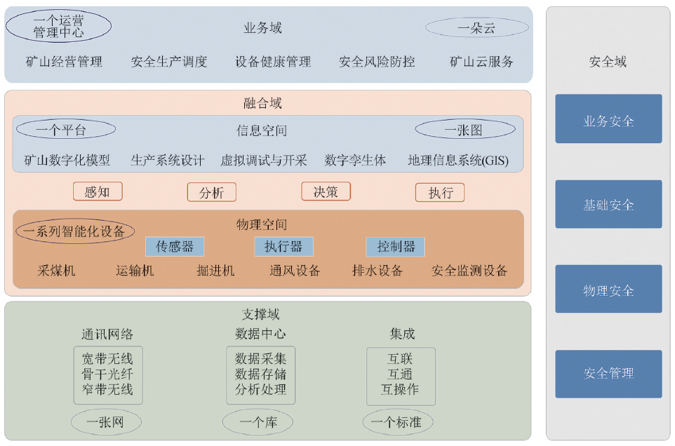 (2)在融合域,“一系列智能化設(shè)備”構(gòu)成物理空間,“一張圖”與“一個(gè)平臺(tái)”包括各類(lèi)三維仿真軟件、數(shù)字孿生體,構(gòu)成信息空間。融合域?qū)崿F(xiàn)信息系統(tǒng)與物理系統(tǒng)交互映射與深度融合,從而實(shí)現(xiàn)礦山生產(chǎn)活動(dòng)信息的智能感知、分析決策、工業(yè)自動(dòng)化控制和安全生產(chǎn)監(jiān)控等。