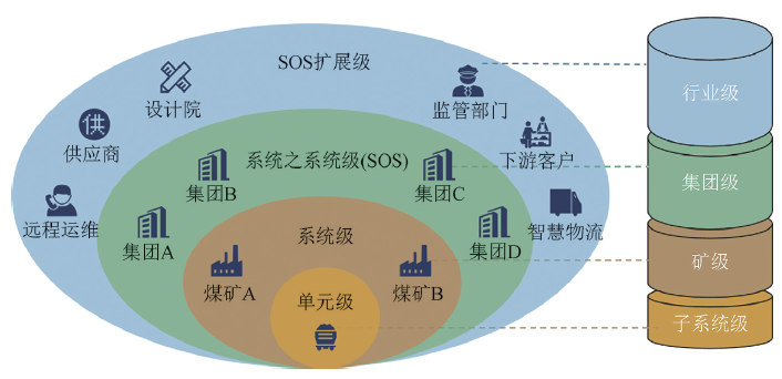 CPS系統(tǒng)具有可擴(kuò)展性和延展性,可不斷向更高層級(jí)發(fā)展,實(shí)現(xiàn)對(duì)人才、技術(shù)、資金等資源和要素的高效整合。在MCPS系統(tǒng)建設(shè)中,可構(gòu)建單元級(jí)、系統(tǒng)級(jí)、系統(tǒng)之系統(tǒng)級(jí) (SOS)、SOS 擴(kuò)展級(jí)應(yīng)用,分別對(duì)應(yīng)于煤礦子系統(tǒng)級(jí)、礦級(jí)、集團(tuán)級(jí)、行業(yè)級(jí)的MCPS系統(tǒng)。在子系統(tǒng)級(jí)主要實(shí)現(xiàn)系統(tǒng)內(nèi)的智能感知、分析決策與控制;在礦級(jí)主要實(shí)現(xiàn)全礦井安全生產(chǎn)管控;在集團(tuán)級(jí)主要實(shí)現(xiàn)生產(chǎn)經(jīng)營(yíng)決策管理;在行業(yè)級(jí)主要面向行業(yè)設(shè)計(jì)、運(yùn)維服務(wù)、上下游產(chǎn)業(yè)鏈、政府監(jiān)管等,實(shí)現(xiàn)工業(yè)互聯(lián)網(wǎng)云端的服務(wù)與管理。在整個(gè)層級(jí)中,集團(tuán)級(jí)服務(wù)于礦級(jí),行業(yè)級(jí)服務(wù)于集團(tuán)級(jí),最終圍繞礦級(jí)進(jìn)行管理與決策。礦級(jí)是整個(gè)層級(jí)擴(kuò)展的核心,也是其他層級(jí)的基礎(chǔ),是MCPS系統(tǒng)建設(shè)的重點(diǎn)。MCPS系統(tǒng)層級(jí)如圖5所示。