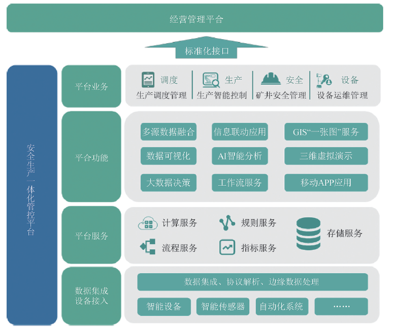 (4)“一個(gè)平臺(tái)”面向智能礦山實(shí)現(xiàn)煤礦安全生產(chǎn)信息感知、計(jì)算、控制、執(zhí)行的安全生產(chǎn)管控一體化平臺(tái),用于管理運(yùn)行各智能生產(chǎn)系統(tǒng)與設(shè)備,實(shí)現(xiàn)礦山生產(chǎn)無(wú)人值守、系統(tǒng)聯(lián)動(dòng)、數(shù)據(jù)融合和調(diào)度管理。