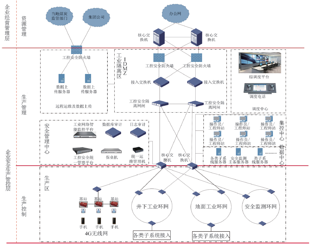 (3)以“生產(chǎn)安全、網(wǎng)絡(luò)安全”為保障,提供安全服務(wù)。目前煤礦生產(chǎn)安全保障系統(tǒng)是智能煤礦的重要建設(shè)內(nèi)容,如“六大避險(xiǎn)系統(tǒng)”以及“風(fēng)險(xiǎn)預(yù)控系統(tǒng)”都已作為礦井安全的建設(shè)重點(diǎn),但在信息化時(shí)代,網(wǎng)絡(luò)安全也是重中之重,要與生產(chǎn)安全放在同等地位。煤礦要建設(shè)安全生產(chǎn)控制專(zhuān)網(wǎng),在生產(chǎn)控制專(zhuān)網(wǎng)與企業(yè)辦公網(wǎng)之間,構(gòu)建工業(yè)安全隔離區(qū),實(shí)現(xiàn)礦山信息的安全性。在企業(yè)經(jīng)營(yíng)管理層、企業(yè)安全生產(chǎn)管控層形成以工業(yè)信息安全防護(hù)為重點(diǎn)的縱深防御,利用工業(yè)隔離網(wǎng)閘、工業(yè)網(wǎng)絡(luò)審計(jì)、工業(yè)態(tài)勢(shì)感知等技術(shù)手段,幫助礦山實(shí)現(xiàn)工業(yè)信息安全保障能力建設(shè)。煤炭企業(yè)典型網(wǎng)絡(luò)安全防護(hù)拓?fù)鋱D如圖 9 所示。