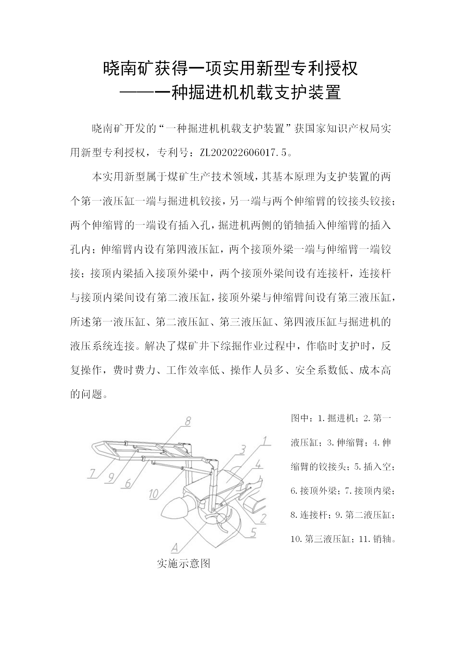 曉南礦獲得一項(xiàng)實(shí)用新型專利授權(quán)——一種掘進(jìn)機(jī)機(jī)載支護(hù)裝置_01