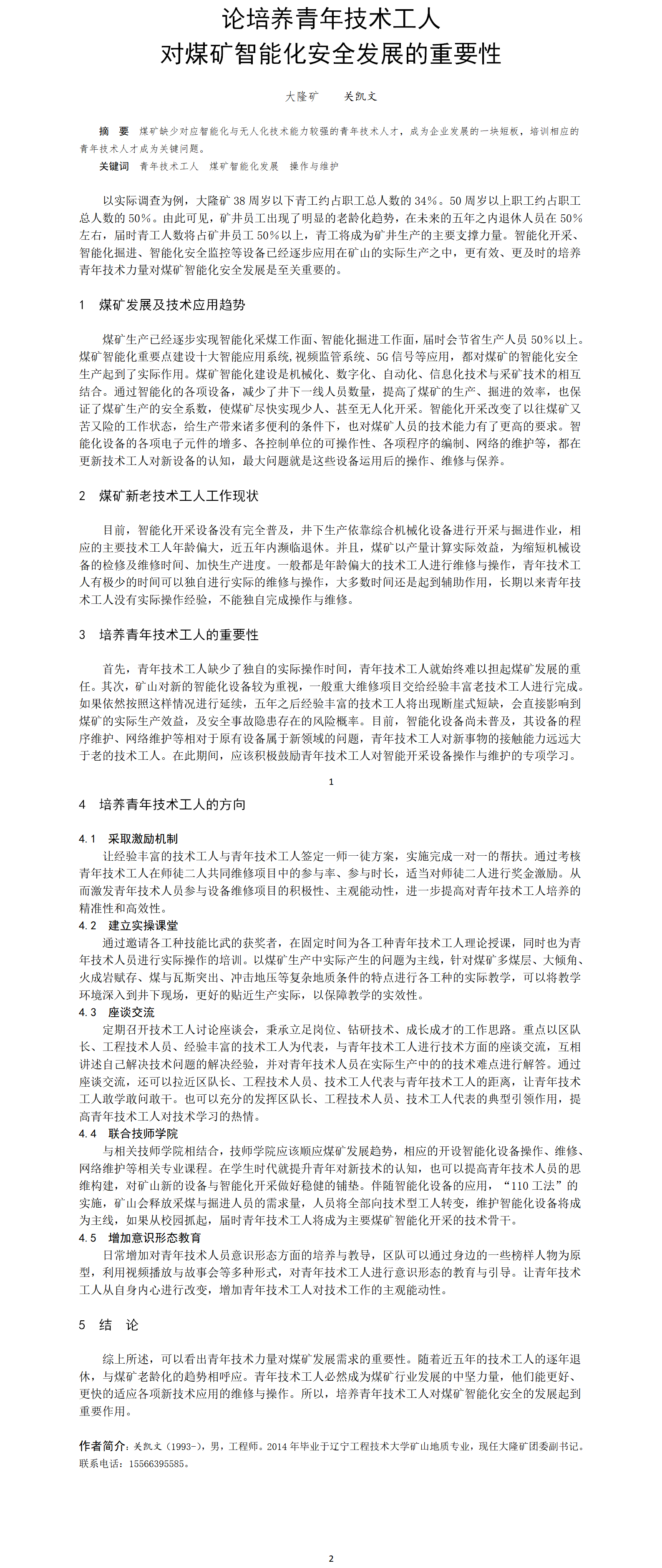 第54屆等級(jí)獎(jiǎng)?wù)撐?--論培養(yǎng)青年技術(shù)工人對(duì)煤礦智能化安全發(fā)展的重要性