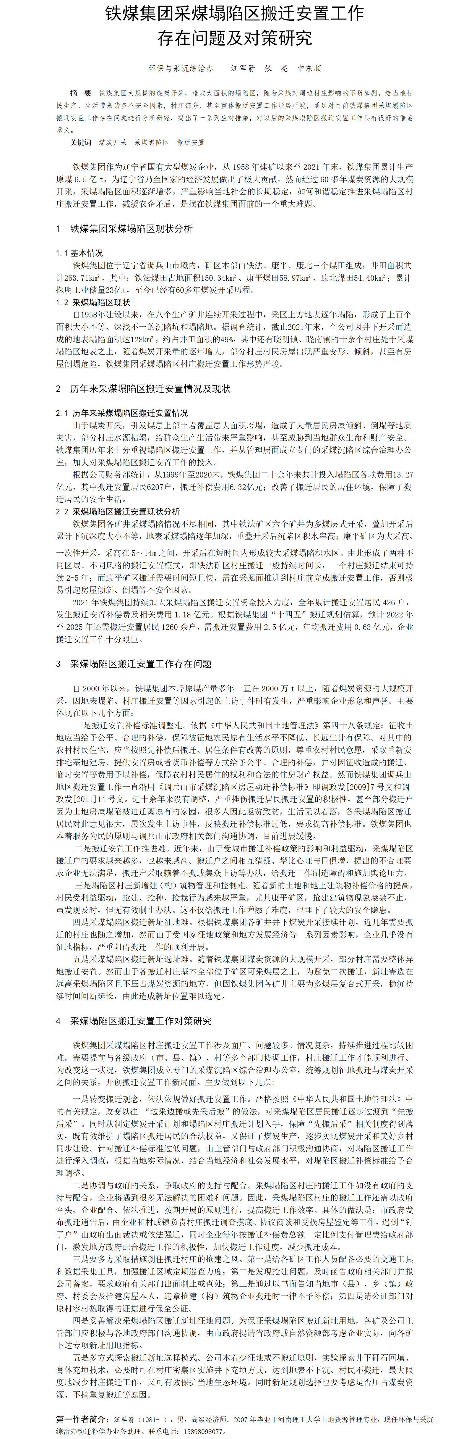 第55屆等級獎(jiǎng)?wù)撐?--鐵煤集團(tuán)采煤塌陷區(qū)搬遷安置工作存在問題及對策研究