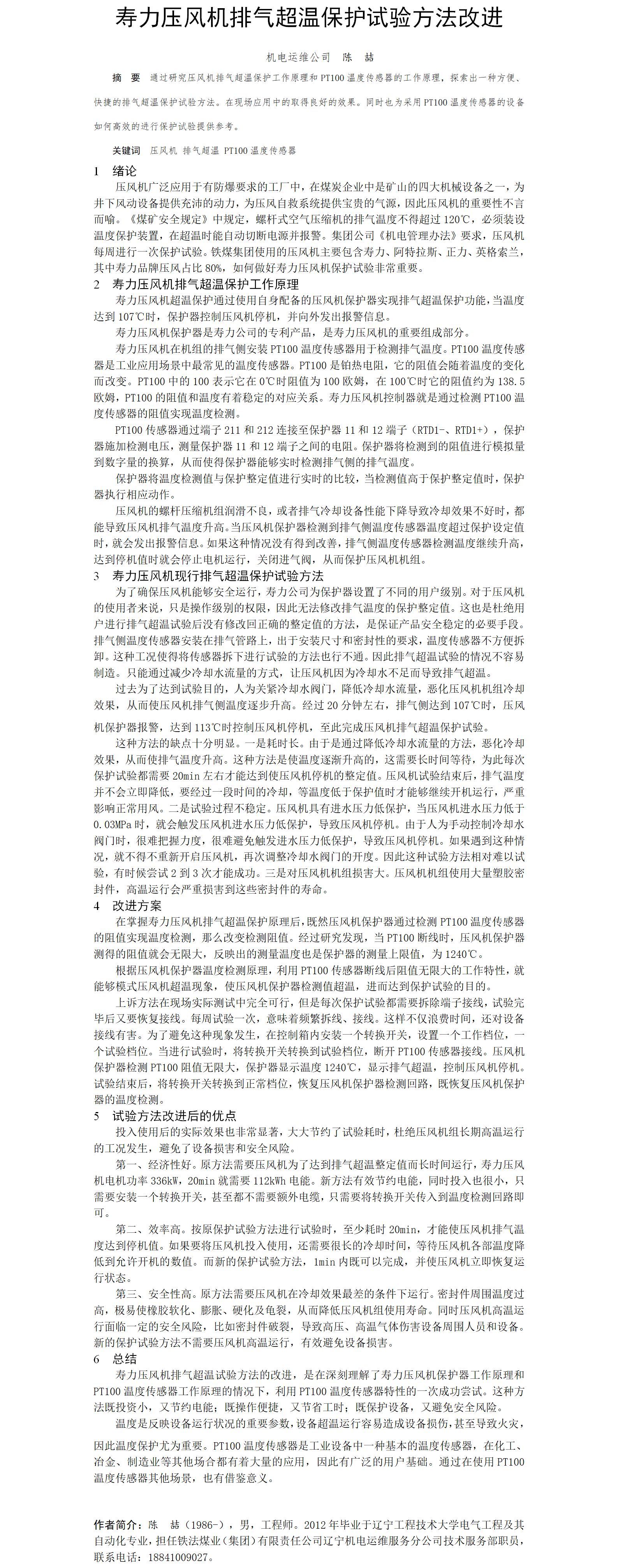 第56屆等級(jí)獎(jiǎng)?wù)撐?--壽力壓風(fēng)機(jī)排氣超溫保護(hù)試驗(yàn)方法改進(jìn)